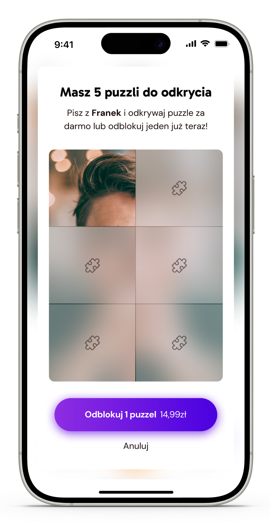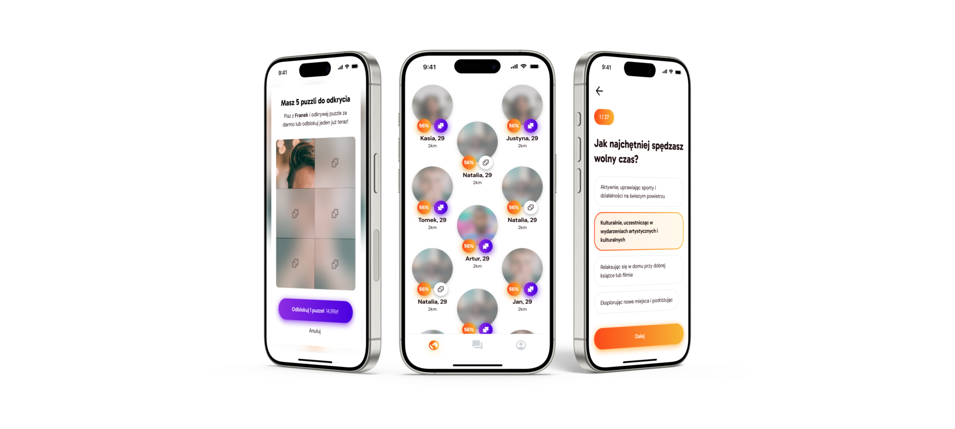 Popularne aplikacje randkowe skupiają się głównie na pierwszym wrażeniu opartym na wyglądzie. To może prowadzić do powierzchowności w relacjach, zaniedbując istotne aspekty osobowości i wspólnych wartości. W aplikacji PUZZLE jest zupełnie inaczej – u nas użytkownicy przede wszystkim muszą skupić się na rozmowie i na poznaniu drugiej osoby.